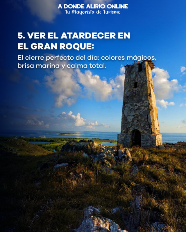 Para cerrar el día con broche de oro, nada supera ver el **atardecer en El Gran Roque**. Subir hacia el antiguo faro te regala una vista panorámica donde los colores mágicos del cielo se mezclan con la brisa marina y una calma total. Es el instante perfecto para agradecer, respirar profundo y terminar de entregarle tu corazón a este destino.