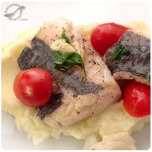Sirve inmediatamente colocando el puré de papas en el centro del plato y los filetes de merluza encima. Baña el pescado y el puré con la mantequilla aromatizada y las mitades de tomates.