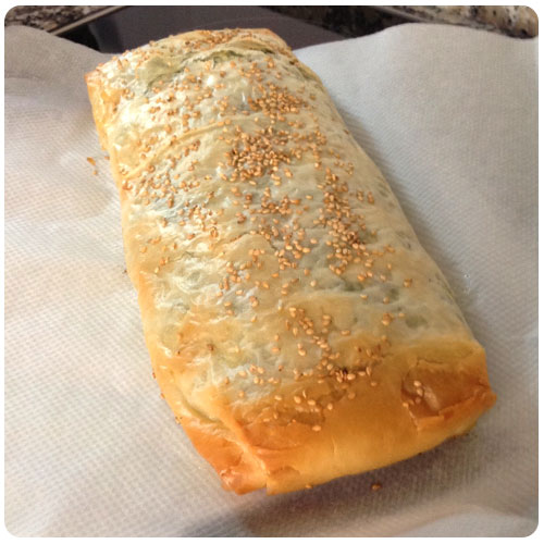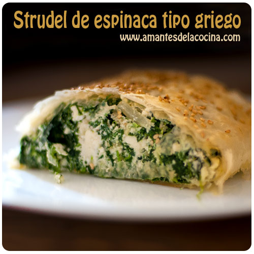 Este strudel de espinacas estilo griego consiste en un rollo de masa filo relleno de espinacas, queso de cabra y queso feta que al ser horneado queda crujiente y delicado.